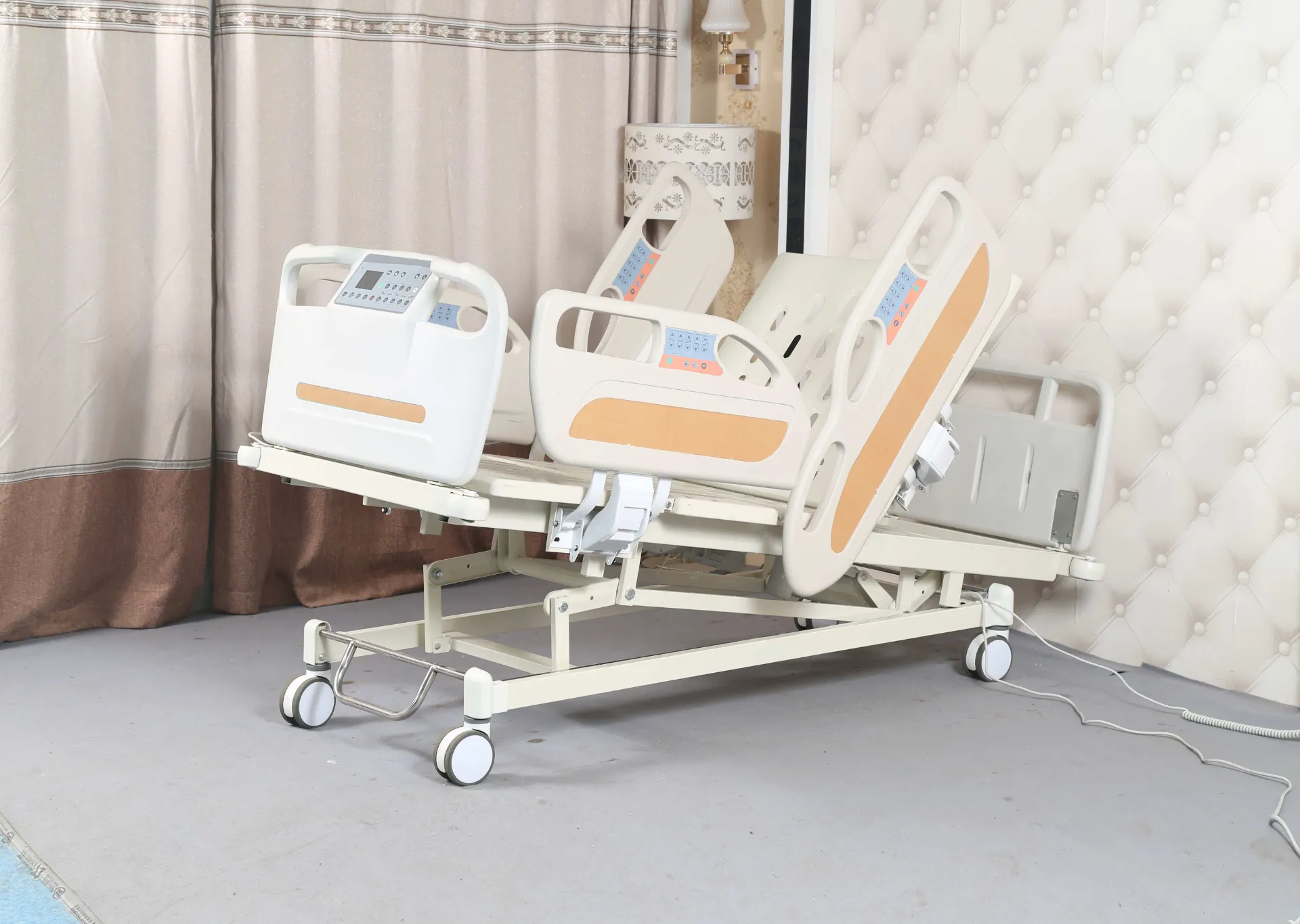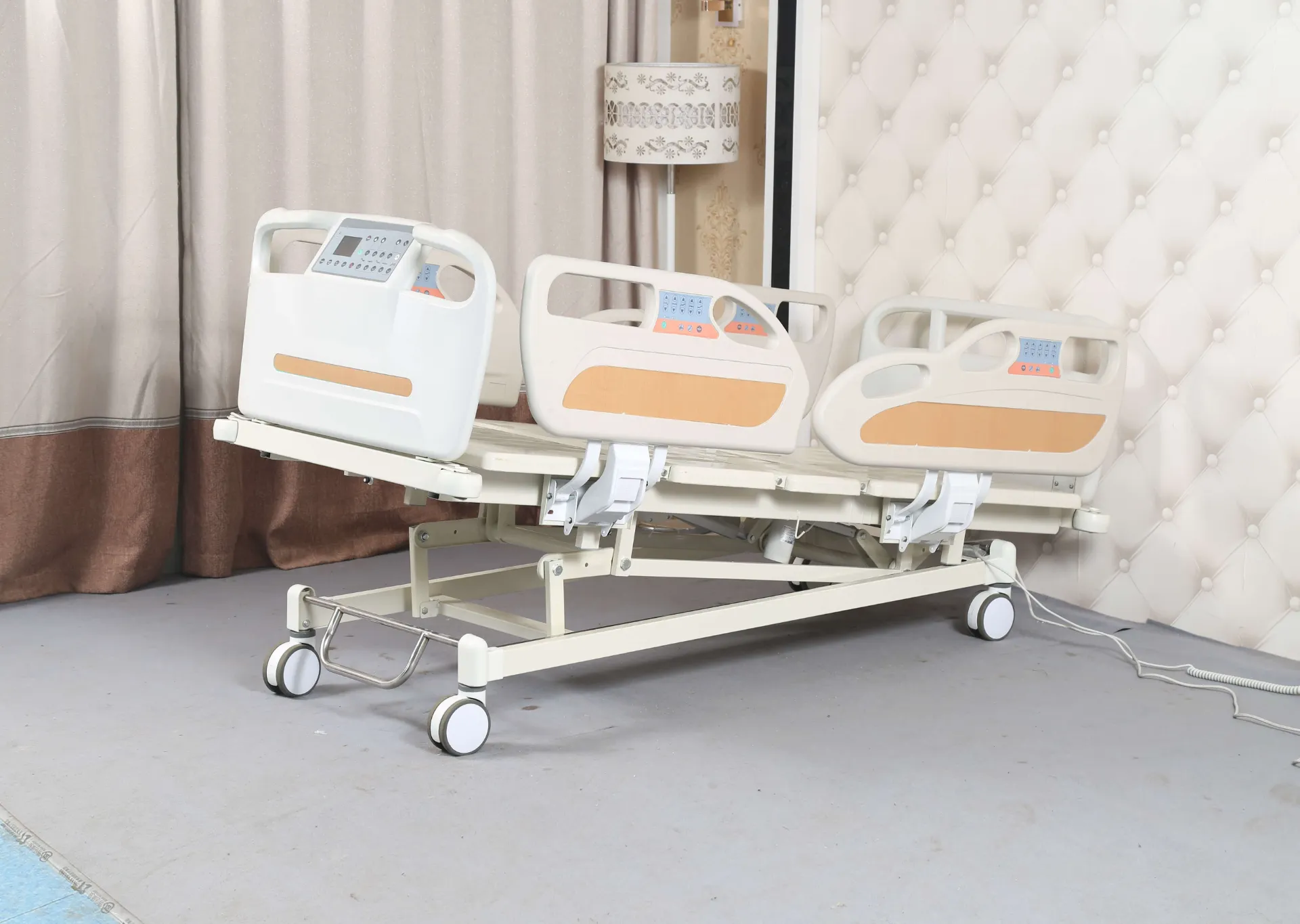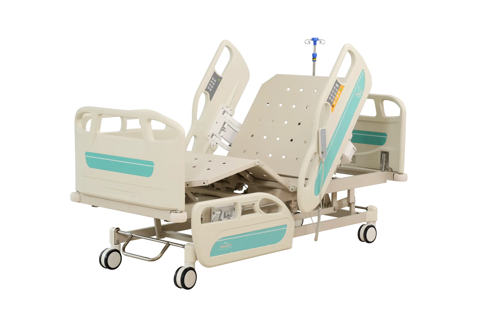 1.The hospital bed adopts a four piece HDPE material fully enclosed guardrail, which is manufactured by blow molding technology. The distance between the guardrail and t headboard, guardrail and bed tail board, and guardrail is less than 8cm. The guardrail can be retracted to below the bed surface through a one click switch, without occupying space.